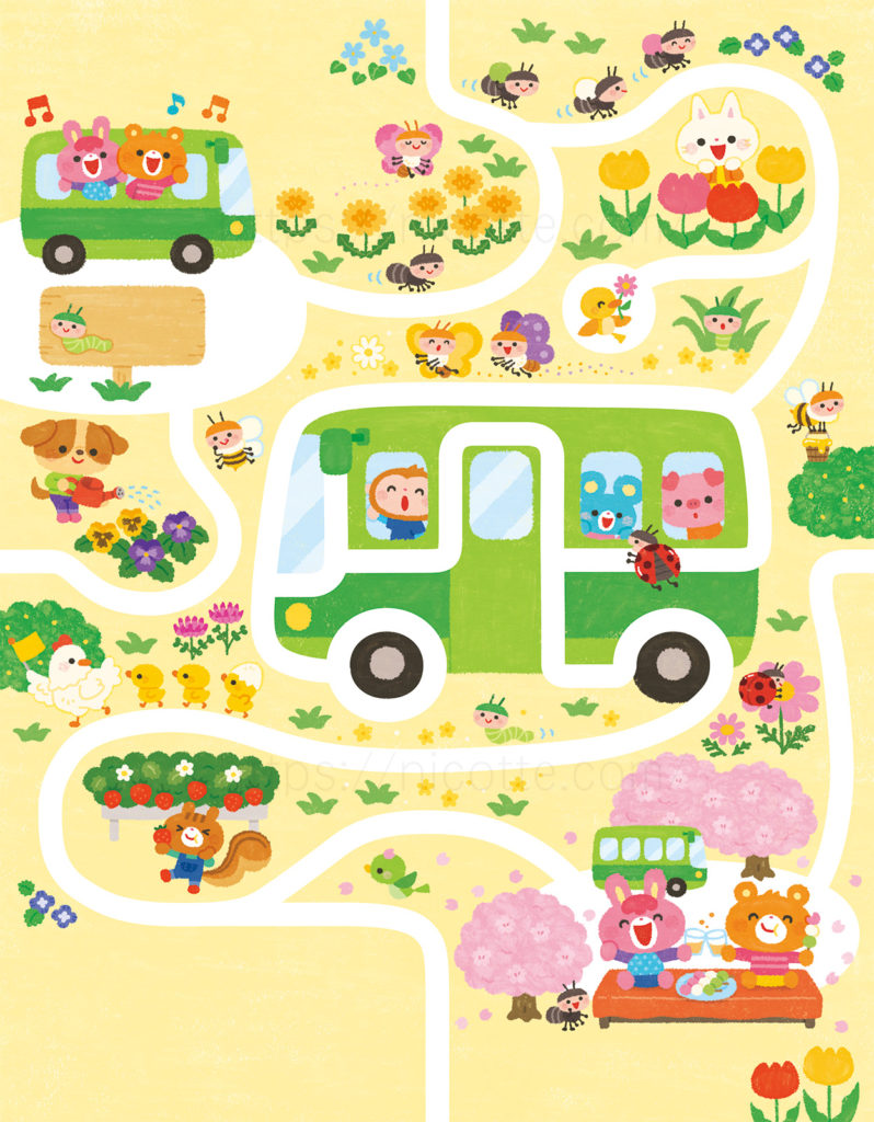 うさぎさんとくまさんが、いろんなのりものにのって、ゴールを目指します。