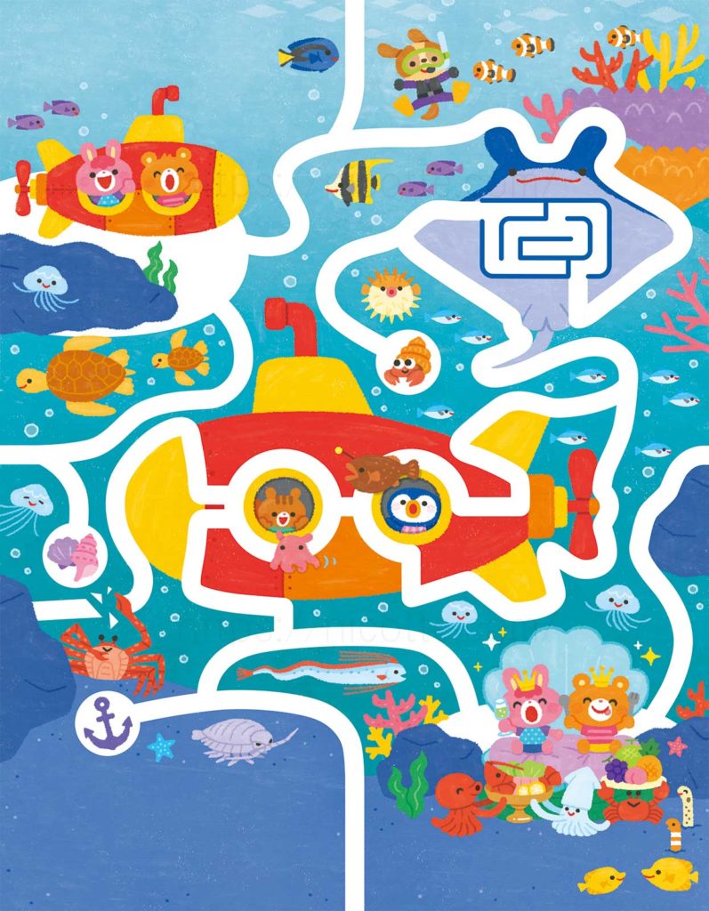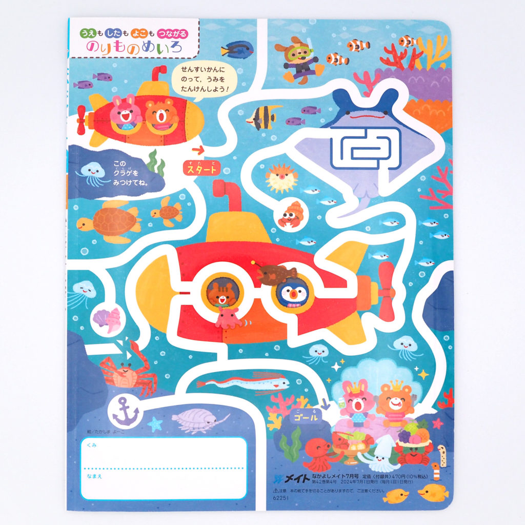WORK / お仕事なかよしメイト2024年度表4迷路7月号 なかよしメイト7月号の「のりものめいろ」7月は「せんすいかん」に乗って、海を探検!絵探しはクラゲさん。たくさんの海のいきものを描いたので、ダイビングを楽しむように、迷路を解いてもらえたら嬉しいです。深海のいきものもいます♪ 表紙イラスト:ほりいえみさん クライアント:メイト制作時期:2023年12月〜使用ソフト:photoshop