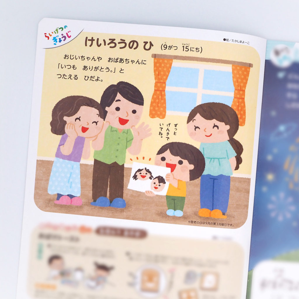 WORK / お仕事「あそぼ!」8月号 行事のイラスト 2025年度「あそぼ!」(チャイルド本社さま)8月号の行事のページのイラストです。8月号では、9月15日の「敬老の日」を紹介。子供がおじいちゃんおばあちゃんに、似顔絵をプレゼントしています。 表紙イラスト:よねこめさん クライアント:チャイルド本社制作時期:2025年2月〜使用ソフト:photoshop