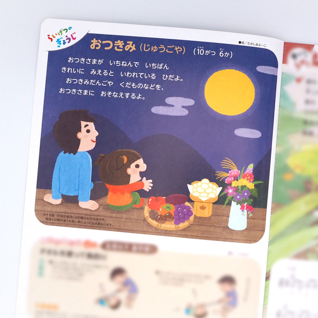 WORK / お仕事「あそぼ!」9月号 行事のイラスト 2025年度「あそぼ!」(チャイルド本社さま)9月号の行事のページのイラストです。9月号では、10月6日の「おつきみ(じゅうごや)」を紹介。 お月さまがきれいに見えるように、そして、お供えの果物や秋の七草も描きました。恥ずかしながら、お月見の時に秋の七草を飾ることを初めて知りました! お月見に興味を持って、楽しみにしてもらえたら嬉しいです。 表紙イラスト:よねこめさん クライアント:チャイルド本社制作時期:2025年3月〜使用ソフト:photoshop