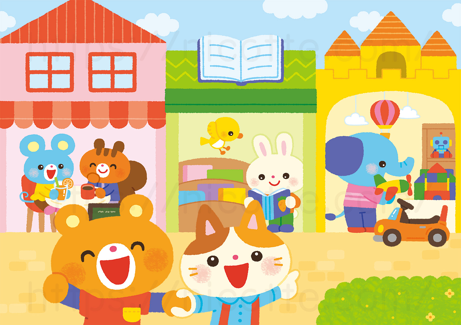WORK / お仕事せいさく「おみせやさん」 GakkenSEED様よりご依頼いただき、2026年度新学期用品「せいさく」のイラストを制作しました。 カフェや本屋さん、おもちゃ屋さんなど、お店屋さんが並ぶ商店街に遊びにきたクマさんとネコさん。みんなも一緒に行こう!とこっちを向いて誘っているようなイラストです。 お子さんたちの制作のモチベーションUPにつながったら嬉しいです! クライアント:GakkenSEED制作時期:2024年12月〜使用ソフト:photoshop
