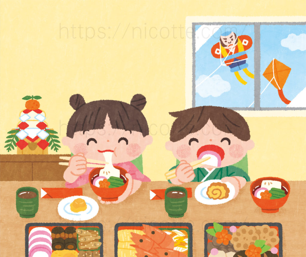 WORK / お仕事「あそぼ!」12月号 行事のイラスト 2025年度「あそぼ!」(チャイルド本社さま)12月号の行事のページのイラストです。12月号では「おしょうがつ」を紹介。 お節料理やお雑煮、初詣、正月遊び、楽しみがいっぱいのお正月。家族で楽しい時間が過ごせますように。 表紙イラスト:よねこめさん クライアント:チャイルド本社制作時期:2025年6月〜使用ソフト:photoshop